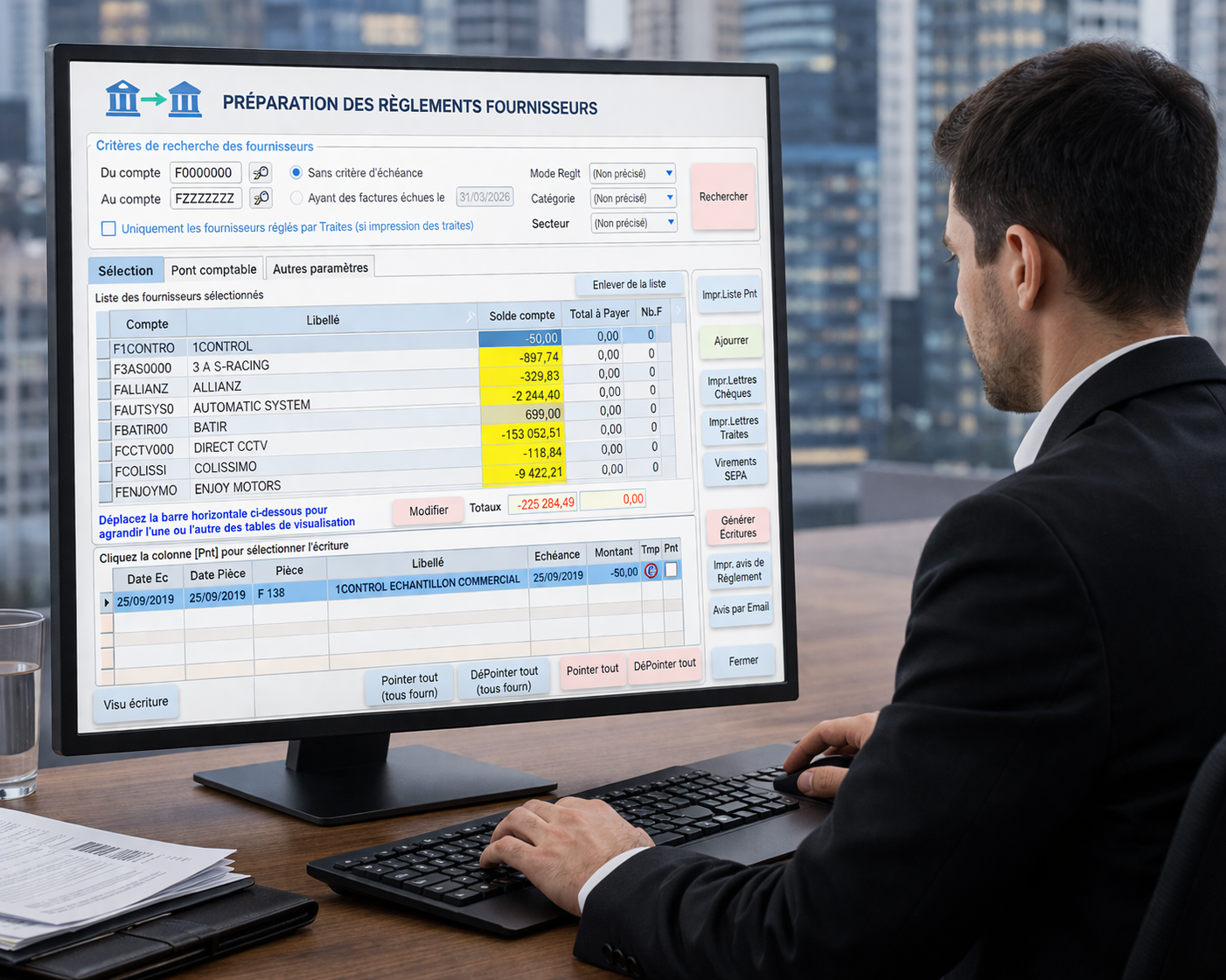 - Génération du fichier normalisé bancaire SEPA qui sera transféré à votre logiciel bancaire pour valider les virements