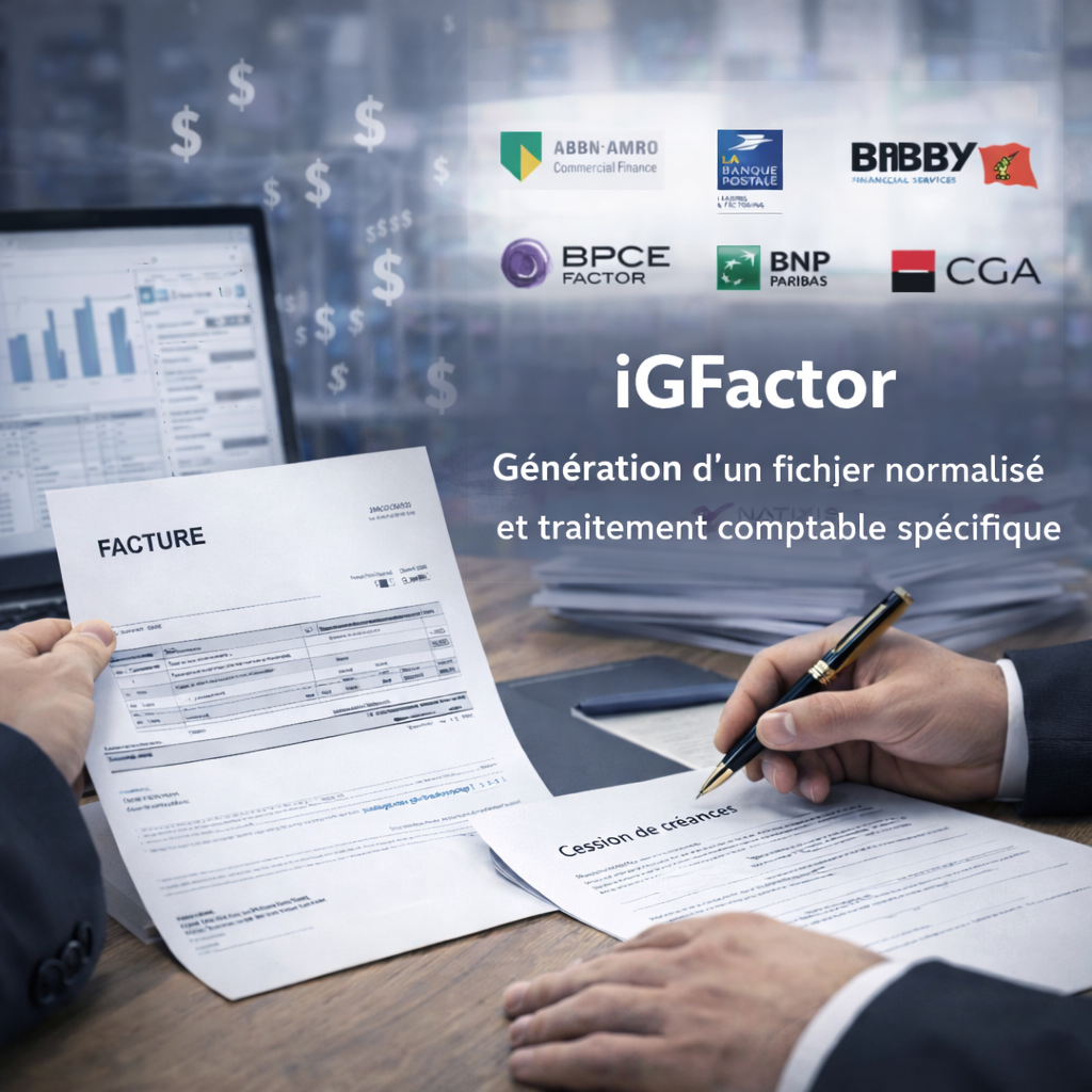 - Le fichier normalisé spécifique peut être envoyé par télétransmission ou par email (module iGEmail requis) au Factor afin d'être traité sans ressaisie manuelle.
