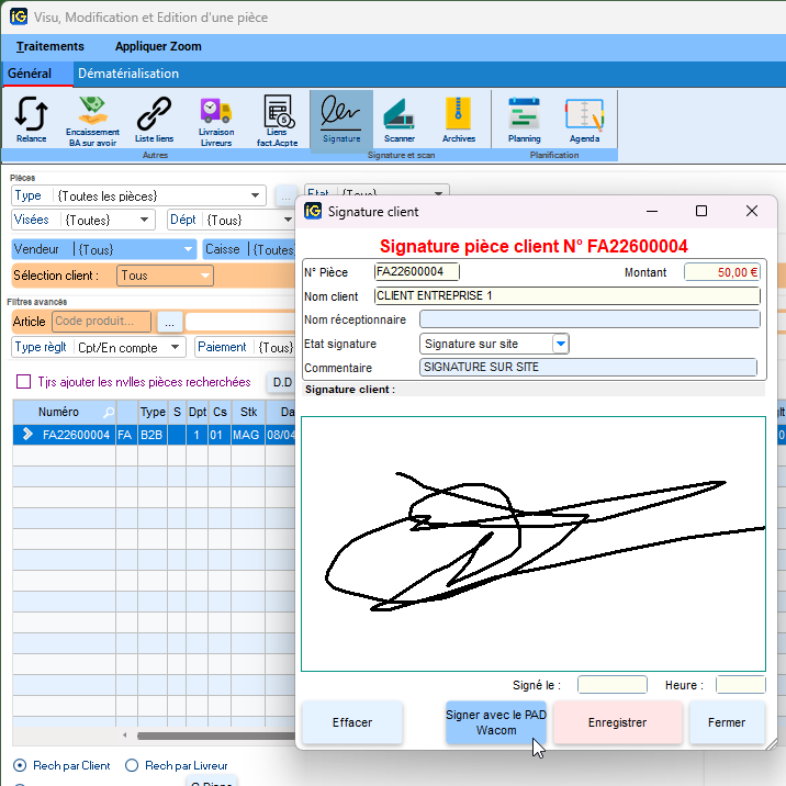 - Enregistrement de la signature dans la pièce client
