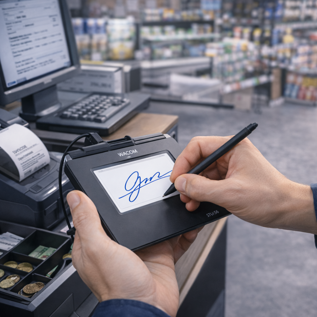 - Signature du client sur la tablette connectée à au poste.